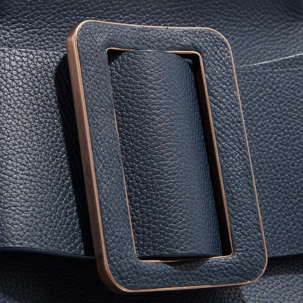 - GleichmĂ€Ăige OberflĂ€che gefertigt aus genarbtem Kalbsleder in Blau fĂŒr einen hochwertigen Charakter