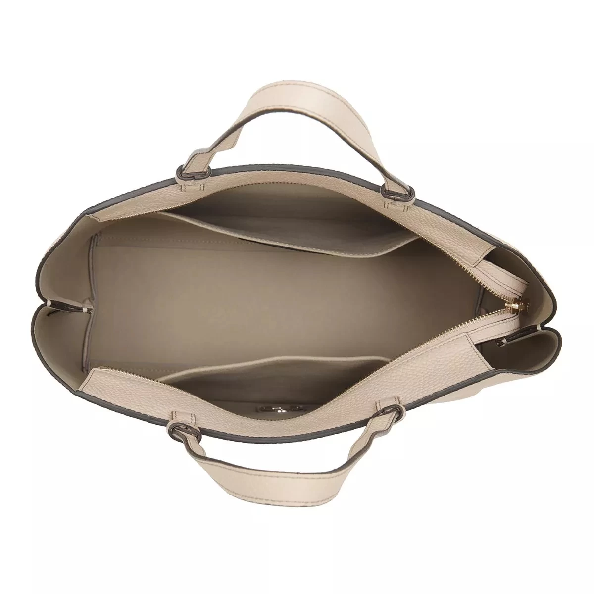 - Tascheninneres bestehend aus langlebigem, beigem Leder mit Designerlogo