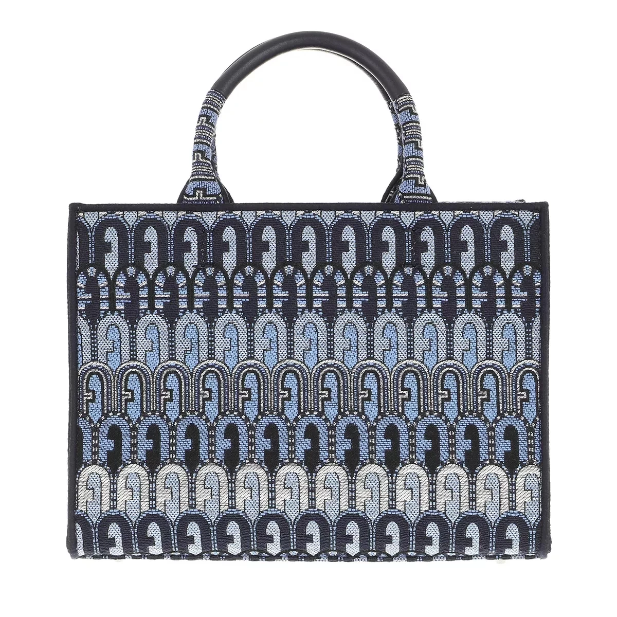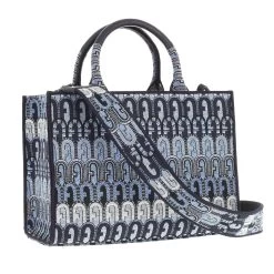 Cool und ausgefallen: Das ist die vielseitige Tote Bag Tessuto Jacquard Arco Etnico Logo Nastro Jacquard Toni Blu Denim von Furla. Bestehend aus geflochtenem Textil in Blau ist die Tote Bag ein softes Accessoire mit leichter Oberfläche. Dieses edle Aussehen der Tote Bag wird durch silberfarbene Metalldetails vervollständigt. In einem Hauptfach lassen sich Gegenstände sicher und unkompliziert unterbringen. Außerdem sorgen drei praktische Zusatzfächer für Struktur und separaten Schutz.