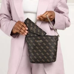 Die handliche Beuteltasche Eco Brenton Bucket Brown Logo von Guess vereint einen eleganten und nostalgischen Look.