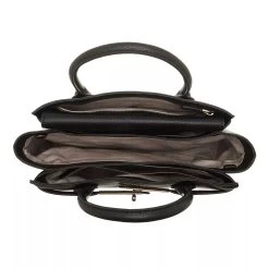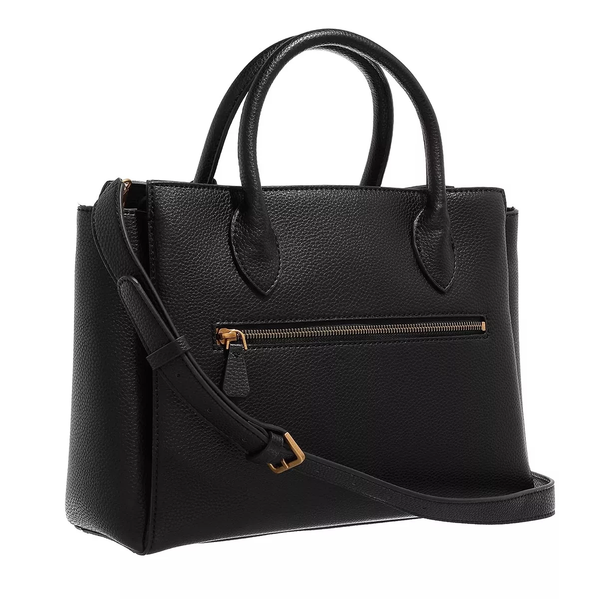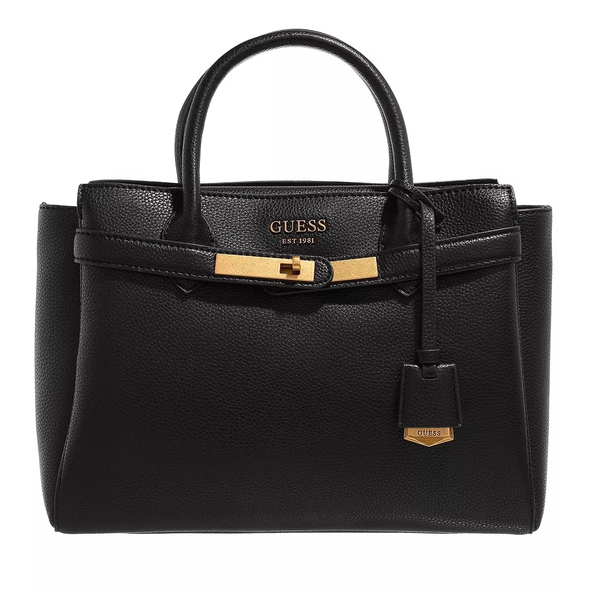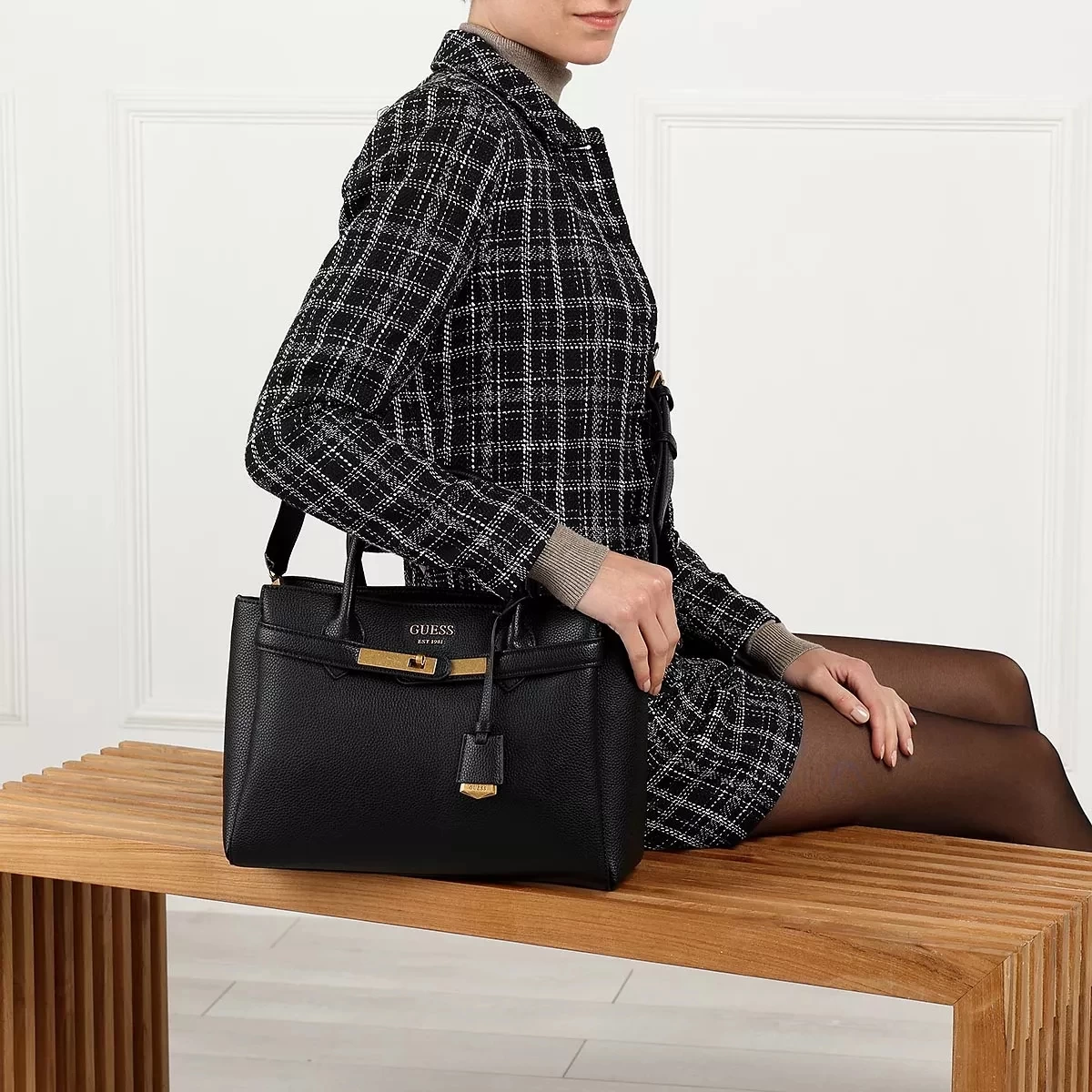 Alltagstauglich und funktional: Das ist die Satchel Enisa High Society Satchel Black von Guess. Das amerikanische Lifestyle Label Guess vereint seit 1981 zeitlosen Hollywood Glanz mit französischem Chic in einem einzigartigen und lebendigen Stil. Bestehend aus genarbtem Kunstleder in Schwarz ist die Satchel ein unempfindliches Accessoire mit pflegeleichter Oberfläche. Mit goldfarbenen Metalldetails und Schnallen setzt die Satchel jedes Outfit edel in Szene. Die Tasche überzeugt mit einem eleganten und akzentuierten Logo-Anhänger. Der Tascheninhalt lässt sich praktisch und sicher in drei Hauptfächern unterbringen. Für Ordnung und separaten Schutz sorgen drei praktische Zusatzfächer. Es sind außerdem zwei Außenfächer angebracht, welche einen schnellen Zugriff auf benötigte Kleinigkeiten möglich machen.