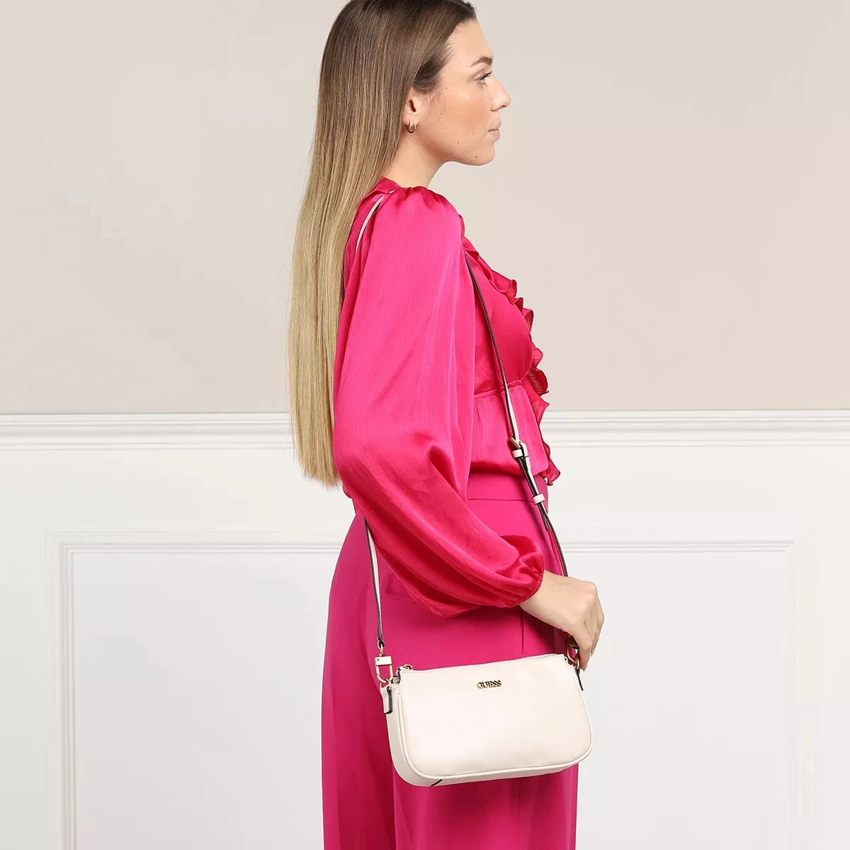 Die vielseitige Crossbody Bag Nell Double Pouch Crossbody Stone von Guess vereint einen entspannten und lockeren Look.