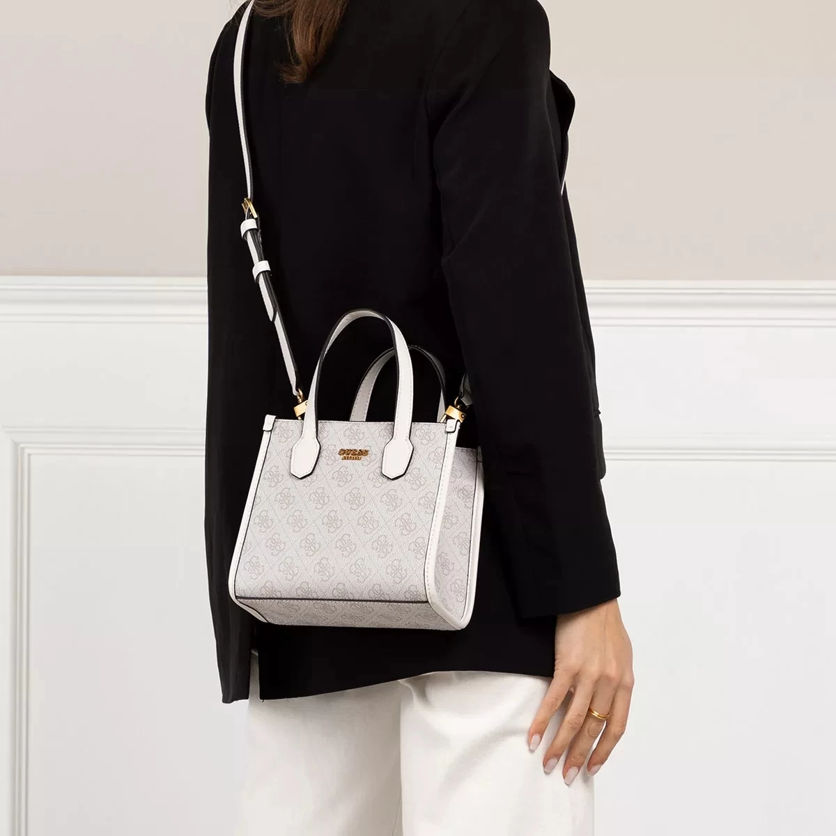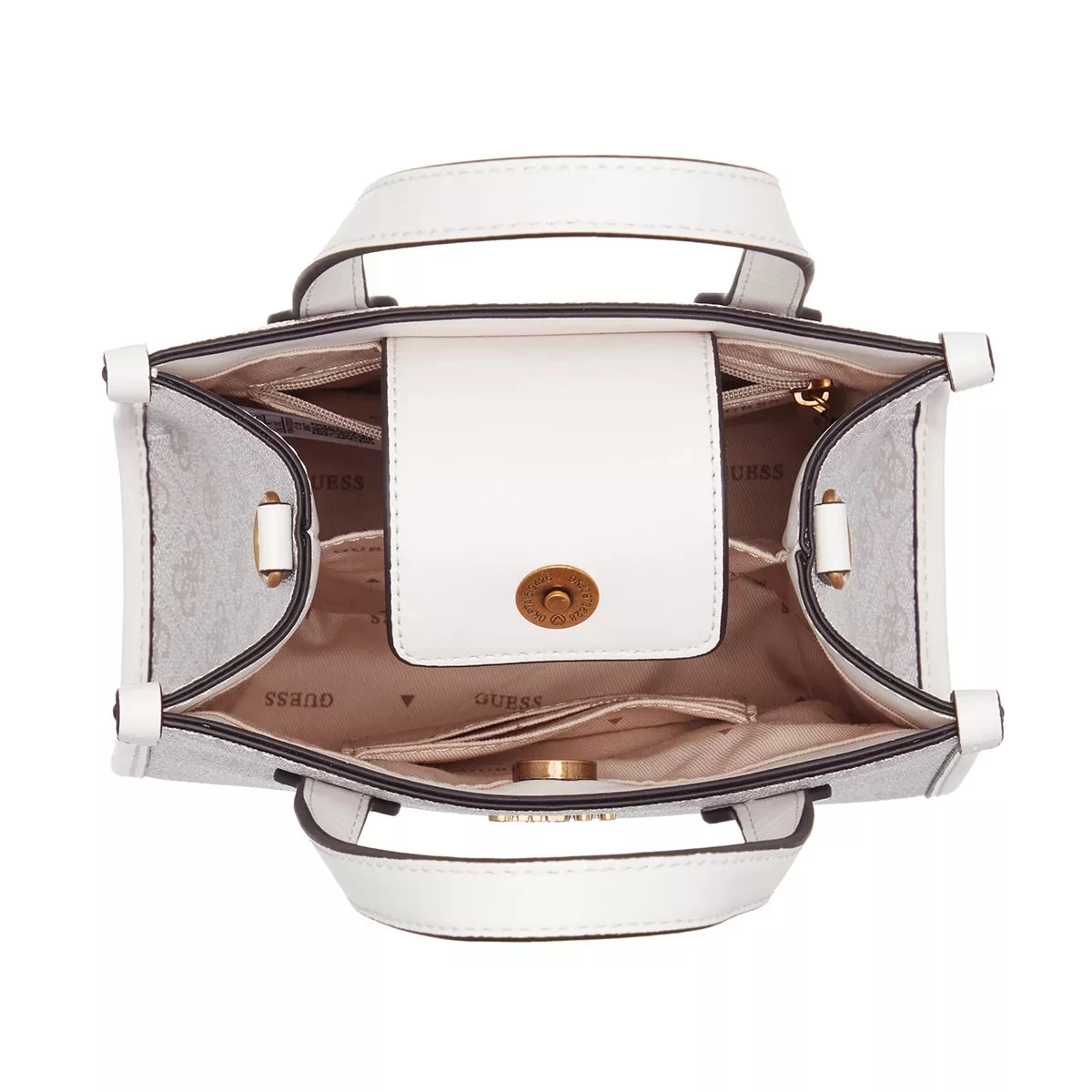 Die Silvana Compartment Mini Tote Dove Logo von Guess ist verspielt und bleibt daneben vielseitig.