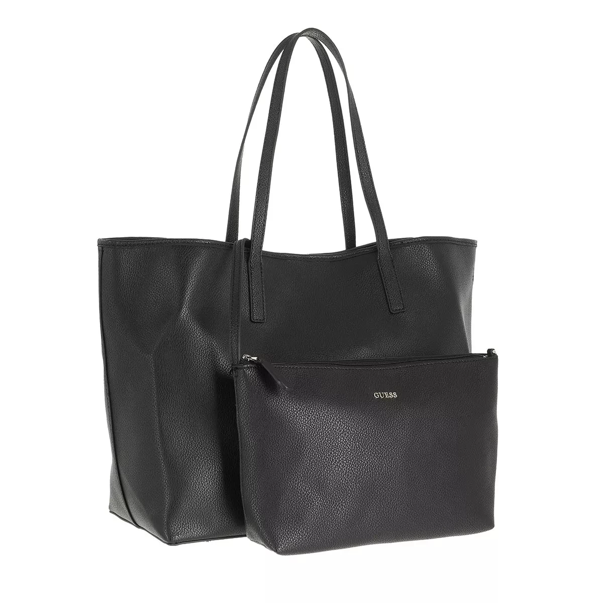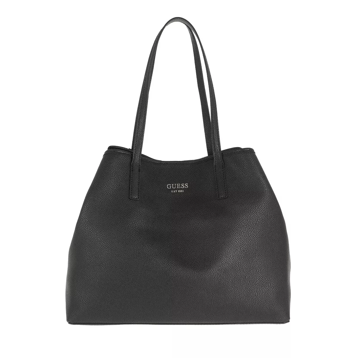 Der Vikky Large Tote Black von Guess ist lässig und daneben alltagstauglich. Der Shopper kann optimal für ein Picknick im Park mit Freunden, auf dem Weg ins Büro oder auf Reisen genutzt werden. Die amerikanische Lifestyle Marke Guess vereint seit 1981 zeitlosen Hollywood Glanz mit französischem Chic in einem unverkennbaren und lebendigen Stil. Bestehend aus genarbtem Kunstleder in Schwarz ist der Shopper ein unempfindliches Accessoire mit robuster Oberfläche. Goldfarbene Metalldetails vervollständigen das edle Aussehen des Shoppers. Die kleine, abnehmbare Tasche bietet Stauraum für Kleinigkeiten und macht den Shopper modisch und besonders. Flexibel und sicher lassen sich Gegenstände in einem Hauptfach verstauen.