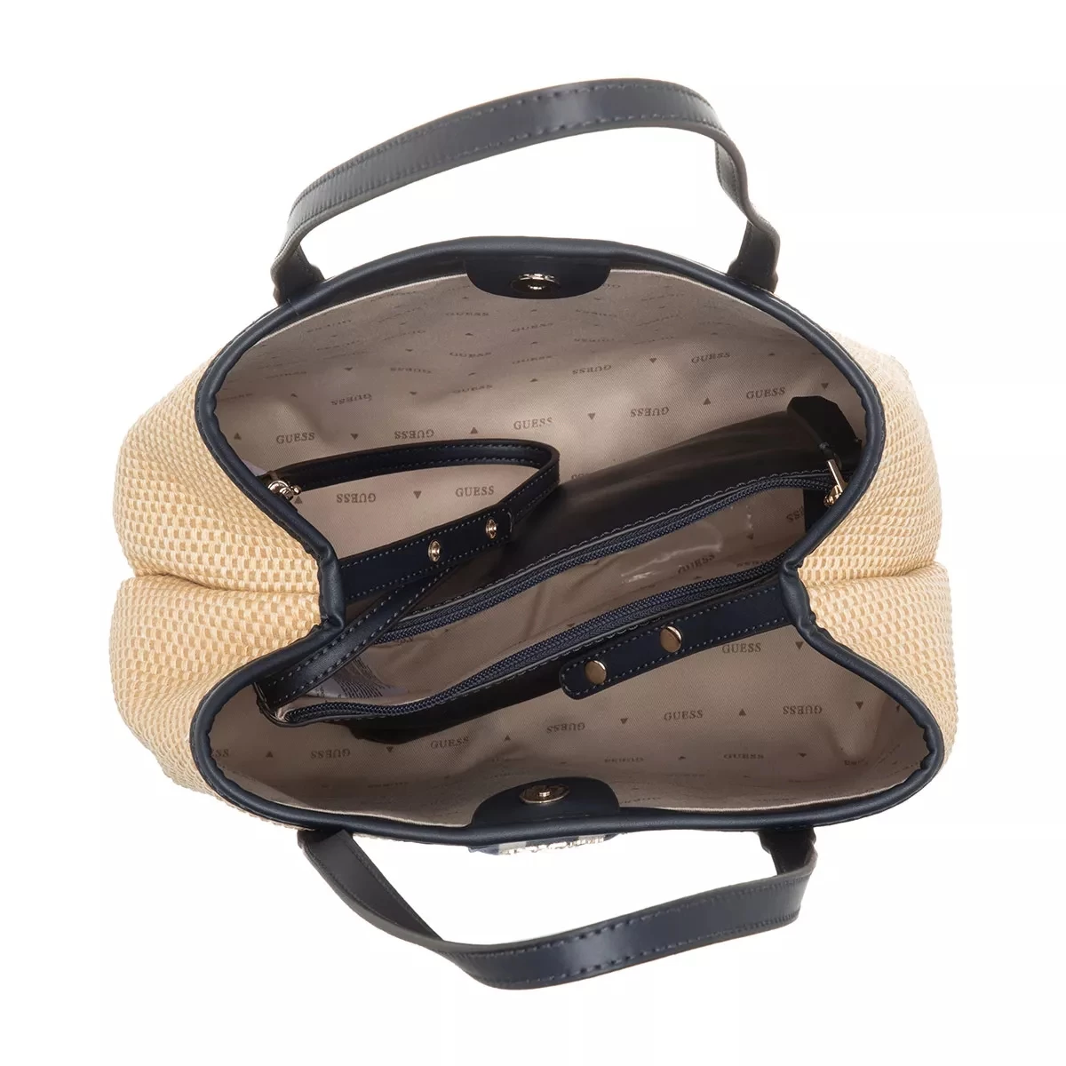 - Innenmaterial bestehend aus weichem, beigem Textil mit Designerlogo