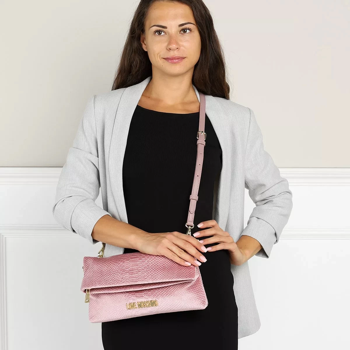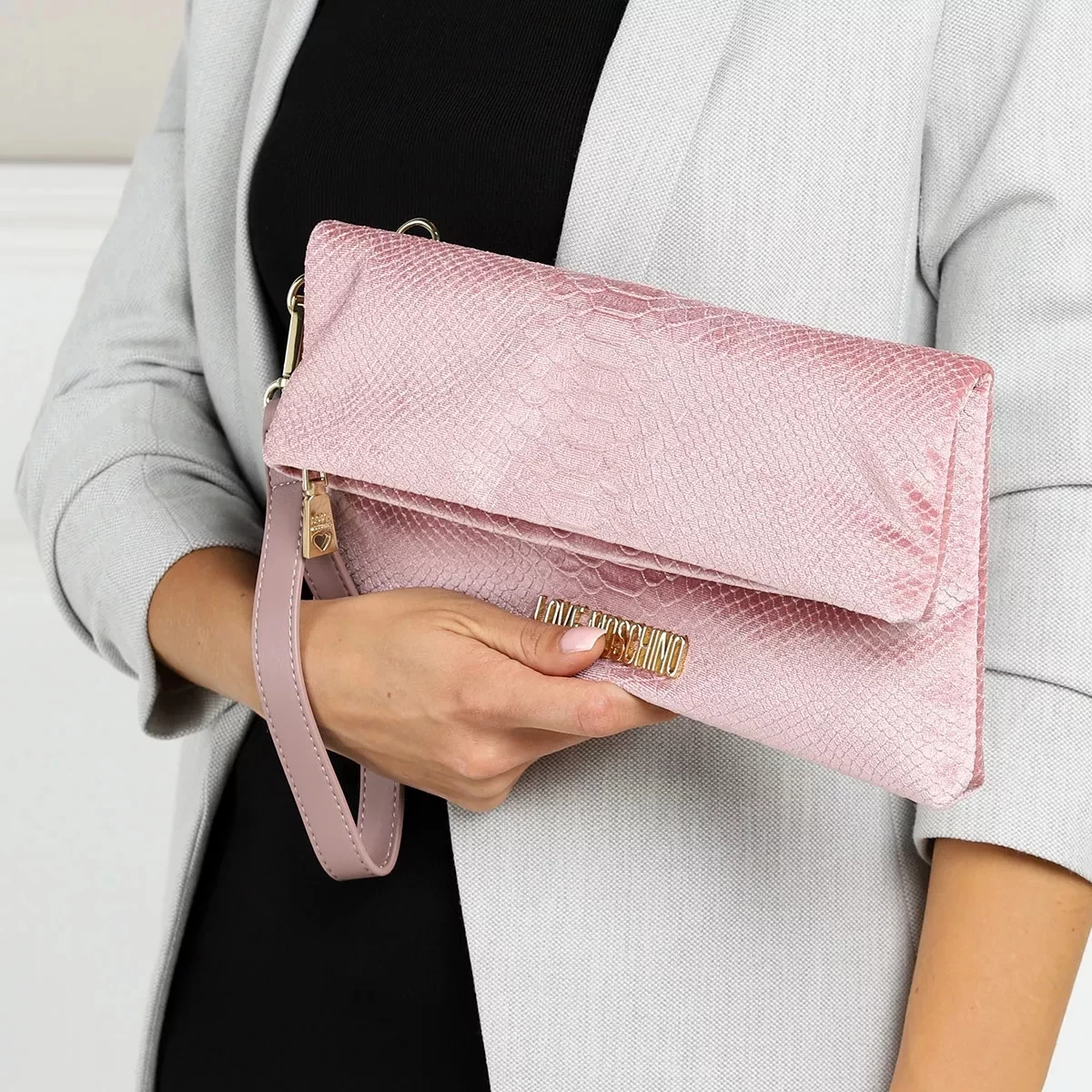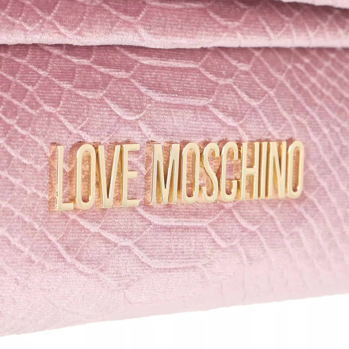 Als besonders verspielt und originell zeigt sich die handliche Crossbody Bag Borsa Velluto St.Anaconda Rosa von Love Moschino.