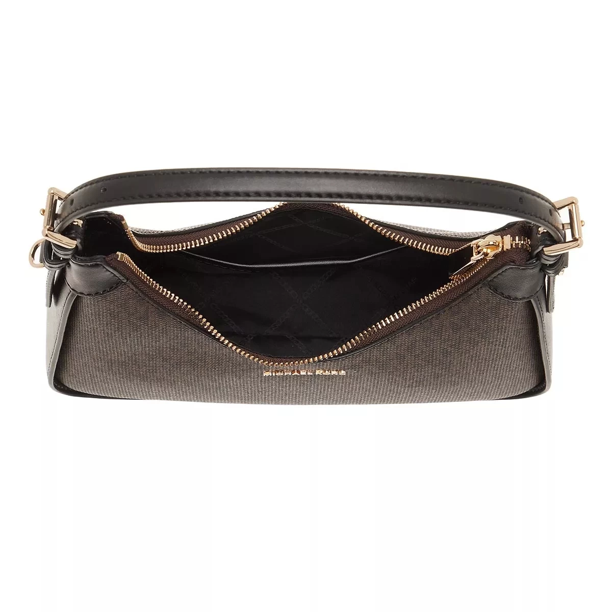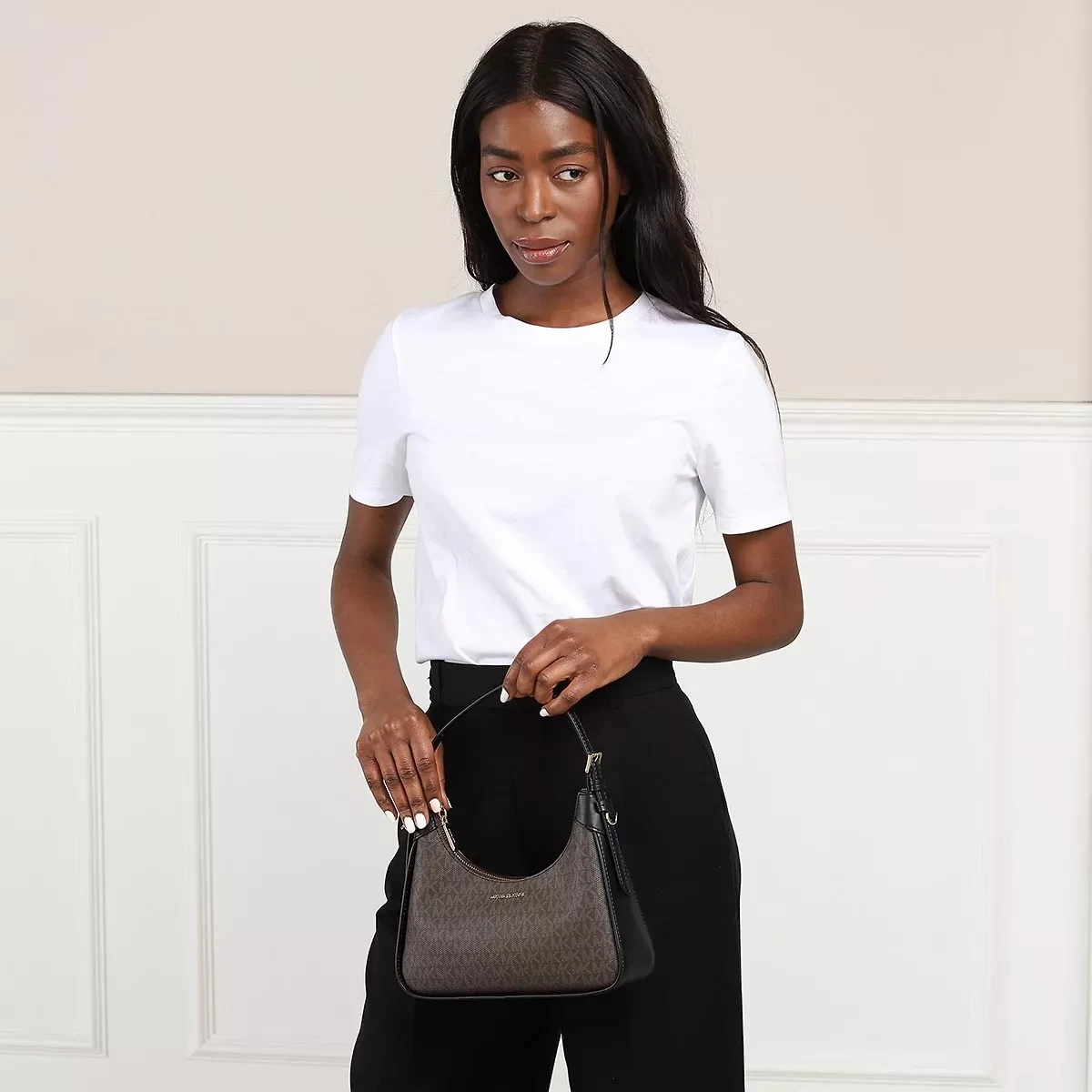 Schlicht und klassisch: Das ist die vielseitige Pochette Md Ew Pouchette Brown/Blk von Michael Kors. Sie besteht aus beschichtetem Canvas in Schwarz und in Braun, die ihr eine natürliche Textur verschaffen. Mit goldfarbenen Metalldetails setzt die Pochette jeden Look stilvoll in Szene. Der Tascheninhalt lässt sich sicher und unkompliziert in einem Hauptfach unterbringen. Für Ordnung und separaten Schutz sorgt ein praktisches Zusatzfach.