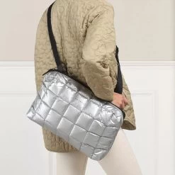 - Aus gestepptem Textil in Silberfarben mit Metallic-Effekt